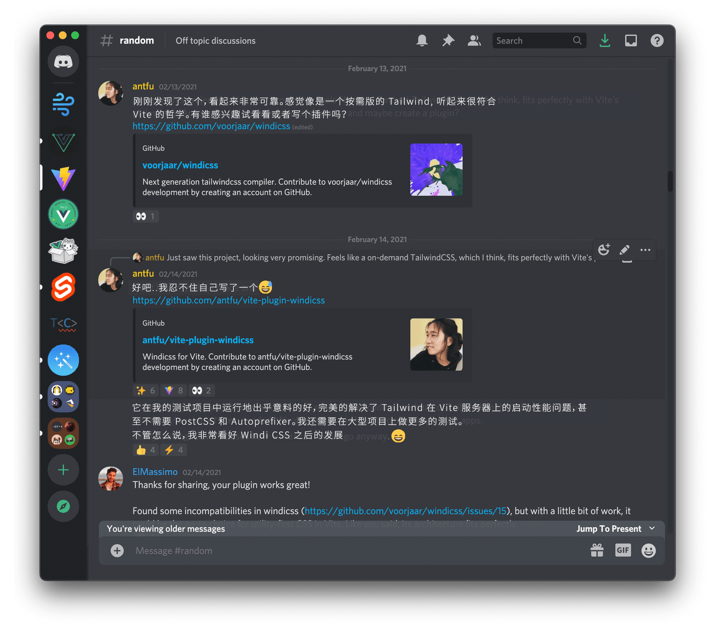 在正式开始前,先来聊聊背景。如果你还不认识我,我叫 Bob,是 Vite 团队的成员,也是 Vitesse (Vite 社区最受欢迎的起手模板之一) 的作者。我享受原子化 CSS 带来的快速开发体验,而因此选择了 Tailwind CSS 作为 Vitesse 的默认 UI 框架。虽然 Vite 较 Webpack 等工具相比,在加载速度上有了大幅提升,但由于 Tailwind 生成了数 MB 的 CSS,使得加载与更新 CSS 成为了整个 Vite 应用的性能瓶颈。我曾以为这是使用为了原子式 CSS 的一种权衡,直到我发现了 Windi CSS。