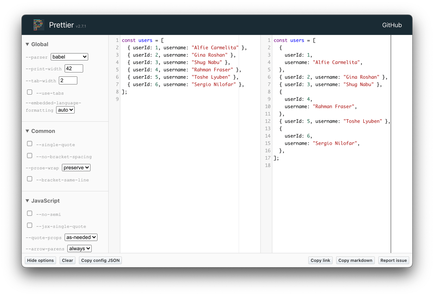 The main thing that itches me a lot is the auto wrapping / unwrapping based on the length of the code. Prettier has the concept of printWidth, which constrains each line to fit with a certain width (by default, it’s 80 characters). It’s generally great to have the code fitting in one screen and avoid horizontal scrolls.