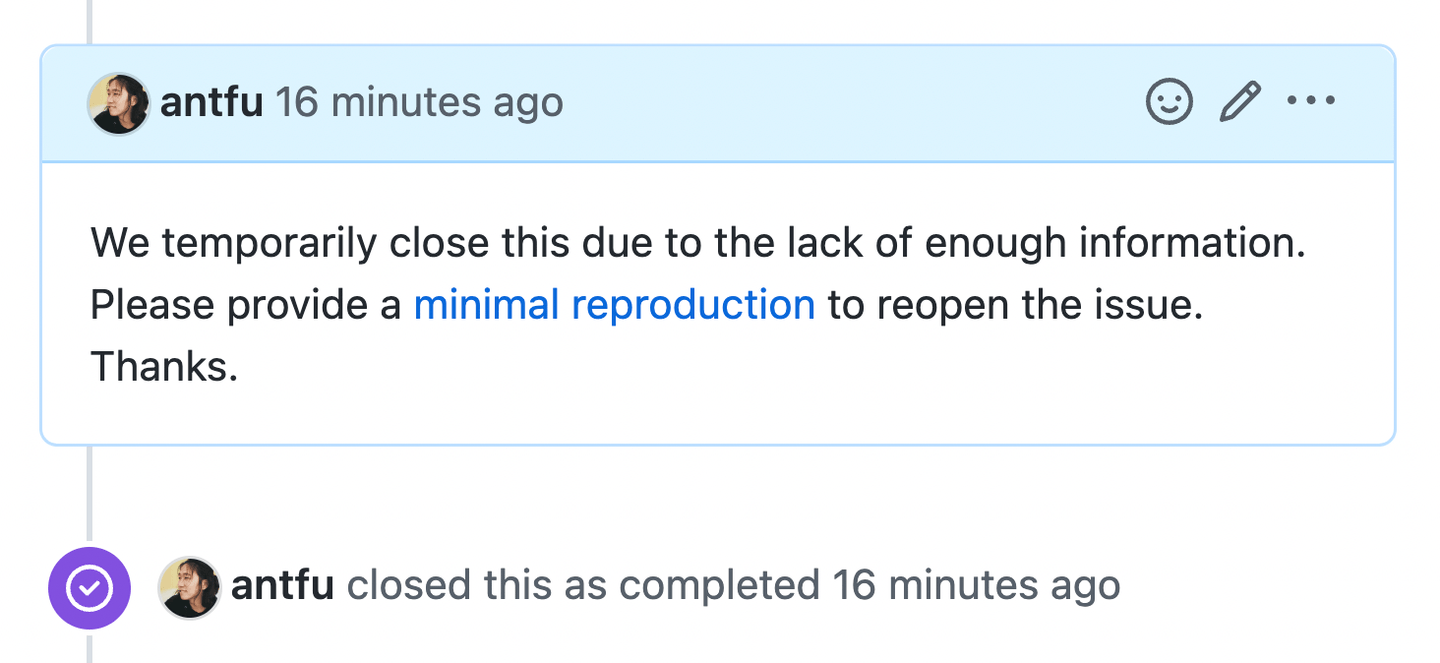 在我看来,要求最小重现是在要求使用者与维护者所花费的努力的公平。如果每个人都能在提 Issue 之前可以花一些时间创建一个最小重现,合集下来就能为维护者节省数百个小时(这甚至可以帮助使用者自己找到解决方案/错误,以至于不再需要提 Issue)。一个经过充分调查和解释的 Issue 也会让维护者更愿意花时间和精力处理。